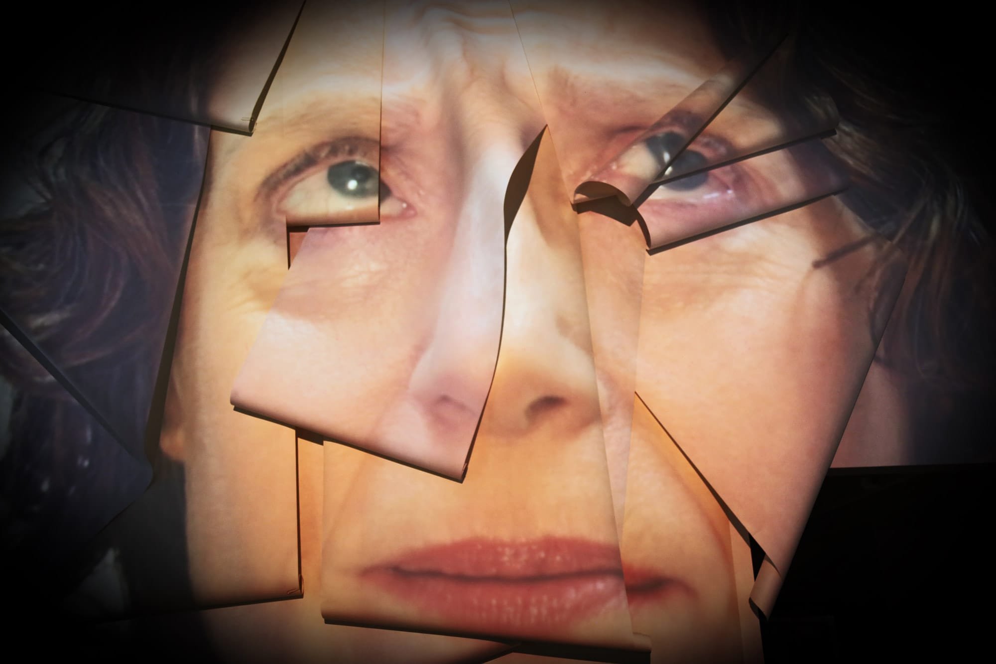 Video is projected onto sculptural materials, creating a fractured image. Opposing ideas are hurled against one another in rapid fire. Visual & sonic structure amplifies narrative juxtaposition.