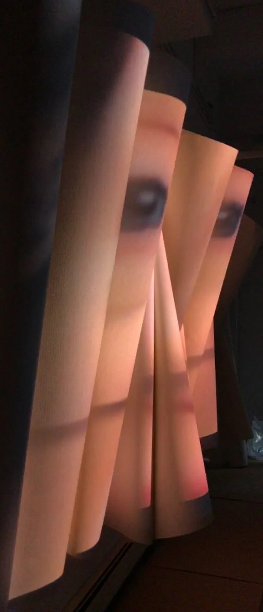 The speaker/projections triangulate. Audio spotlight speakers focus sound physically into a 6’ beam. You walk in and out of their beams. Where the focused beam of two speakers cross over, you hear the narrative of two video projections. Each video is understood more acutely the further you stand away from the speaker, allowing you to experience the hive & the clarity of one. Mimicking the chatter of the mind, this complicates our understanding.