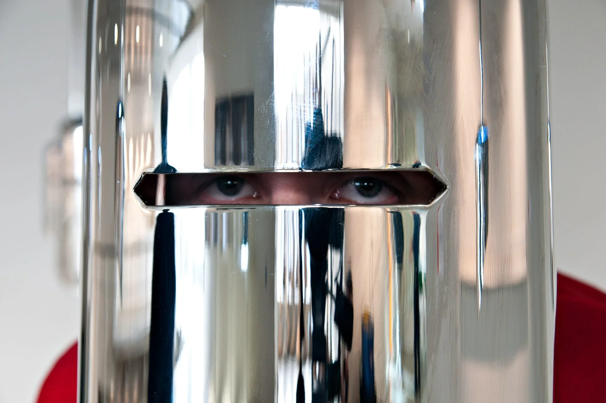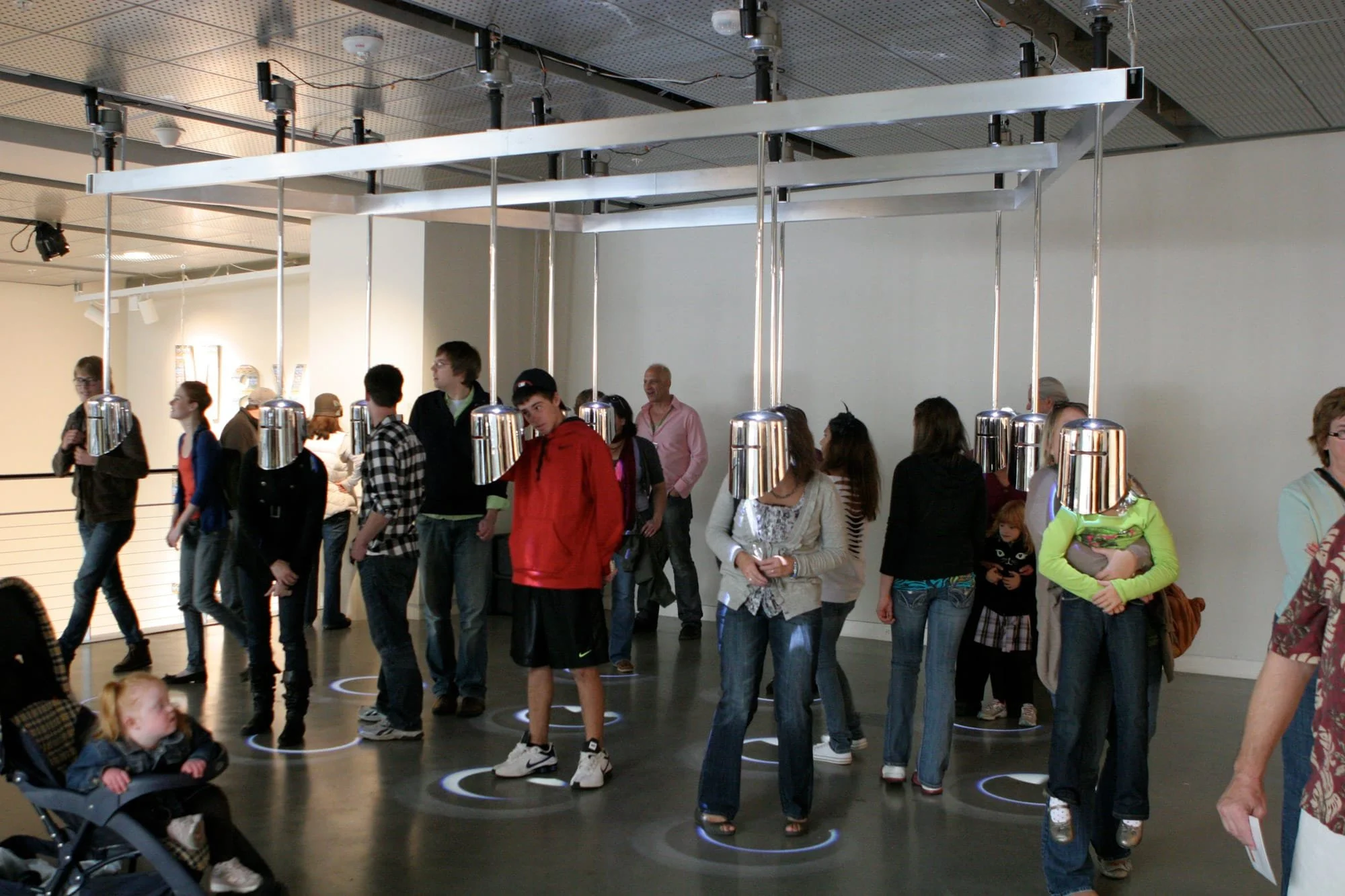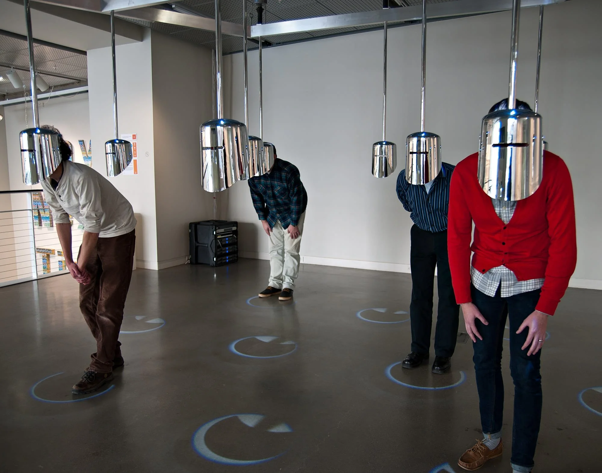 “Among the most sophisticated in terms of concept and form was Wappen Field by Michelle Jaffé, of New York. A group of highly polished, frontal helmets is suspended from the ceiling. Viewers are encouraged to step forward from behind and experience the helmet as if wearing it.”