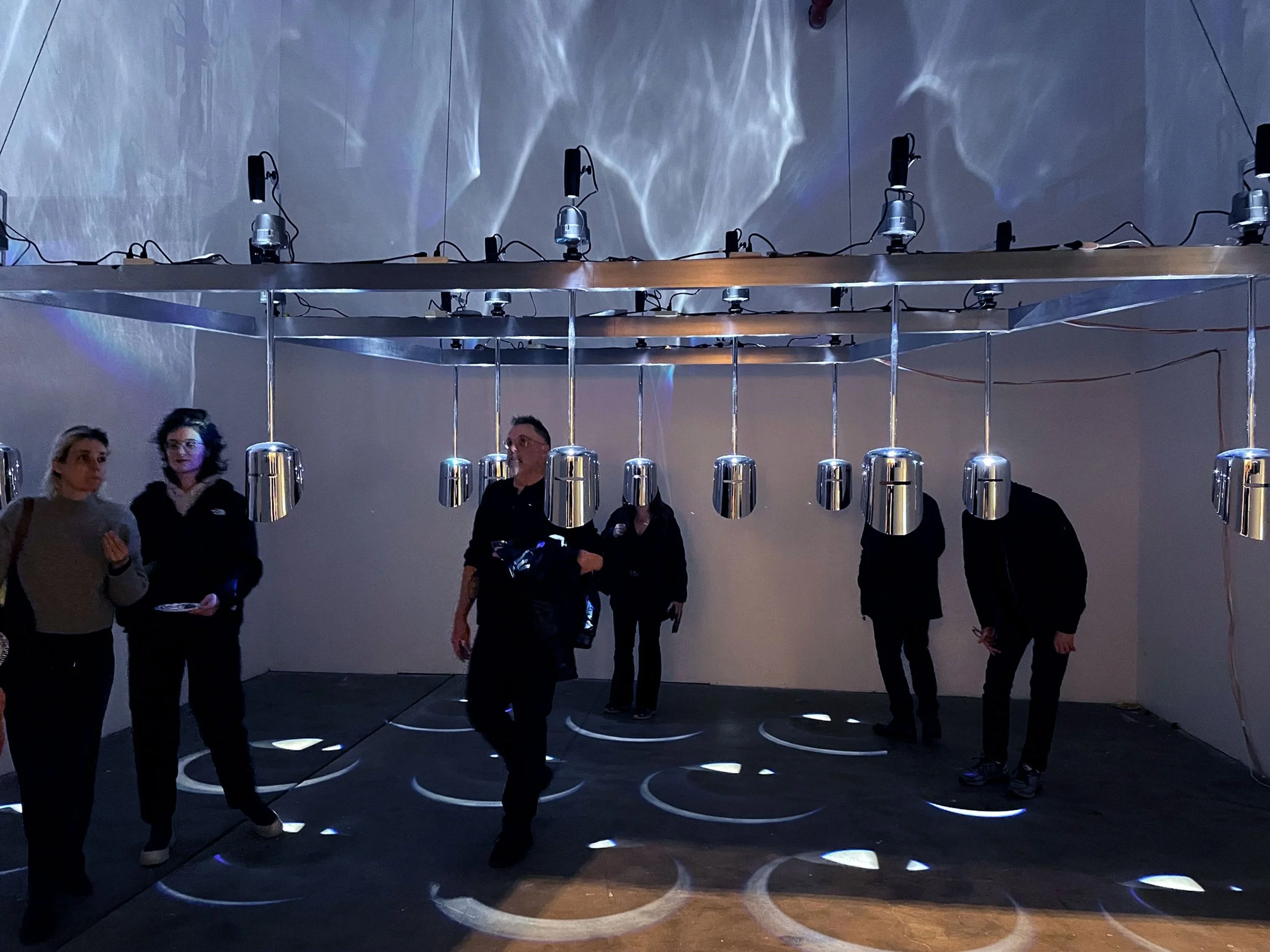 Wappen Field is a participatory sound installation featuring 12 chrome-plated steel helmets that serve as resonant chambers, transforming the sculpture into an immersive audio environment.