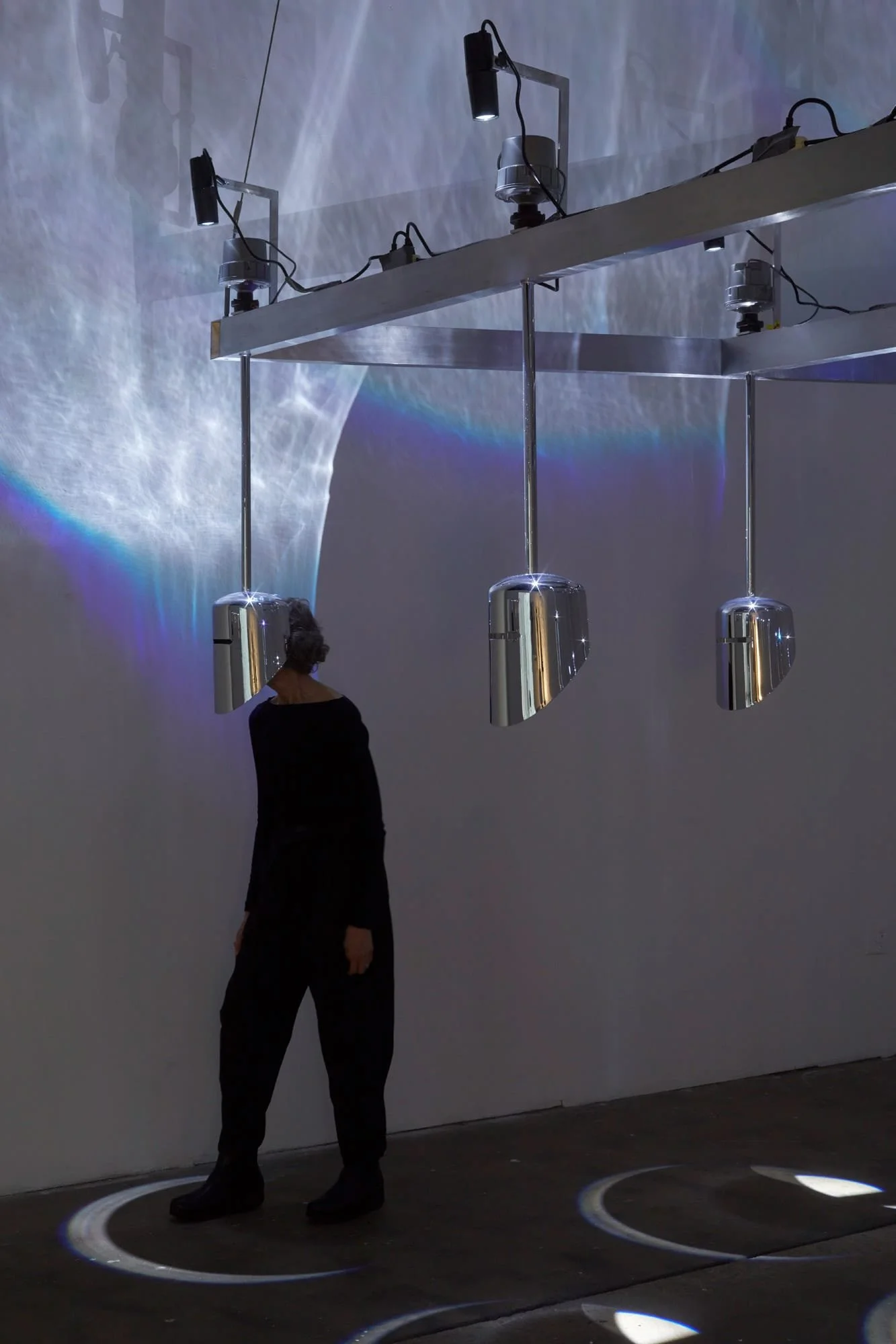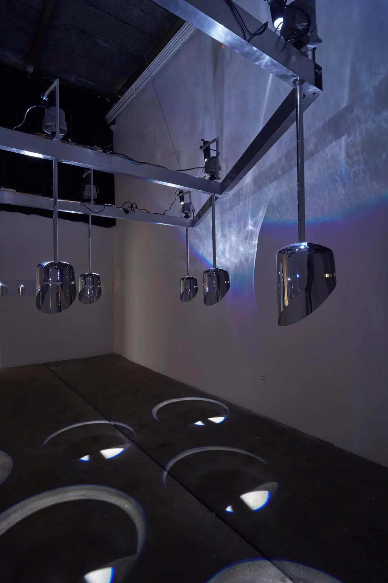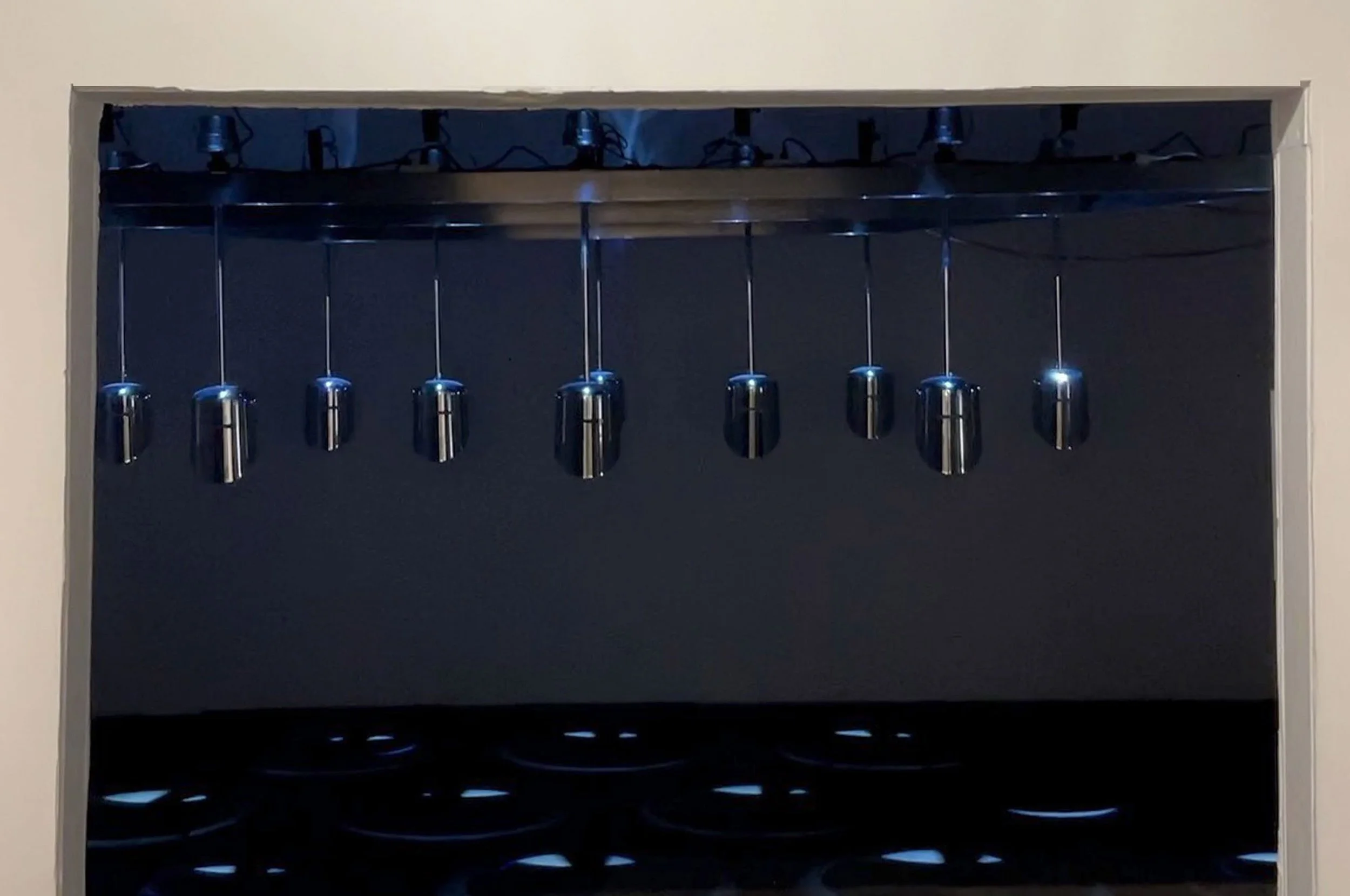 Chrome Plated Steel, Speaker Drivers, Mirror, LED’s, Amplifiers, Audio Interface, Power Conditioner, SuperCollider, Aluminum Structure, Computer, Mirror,